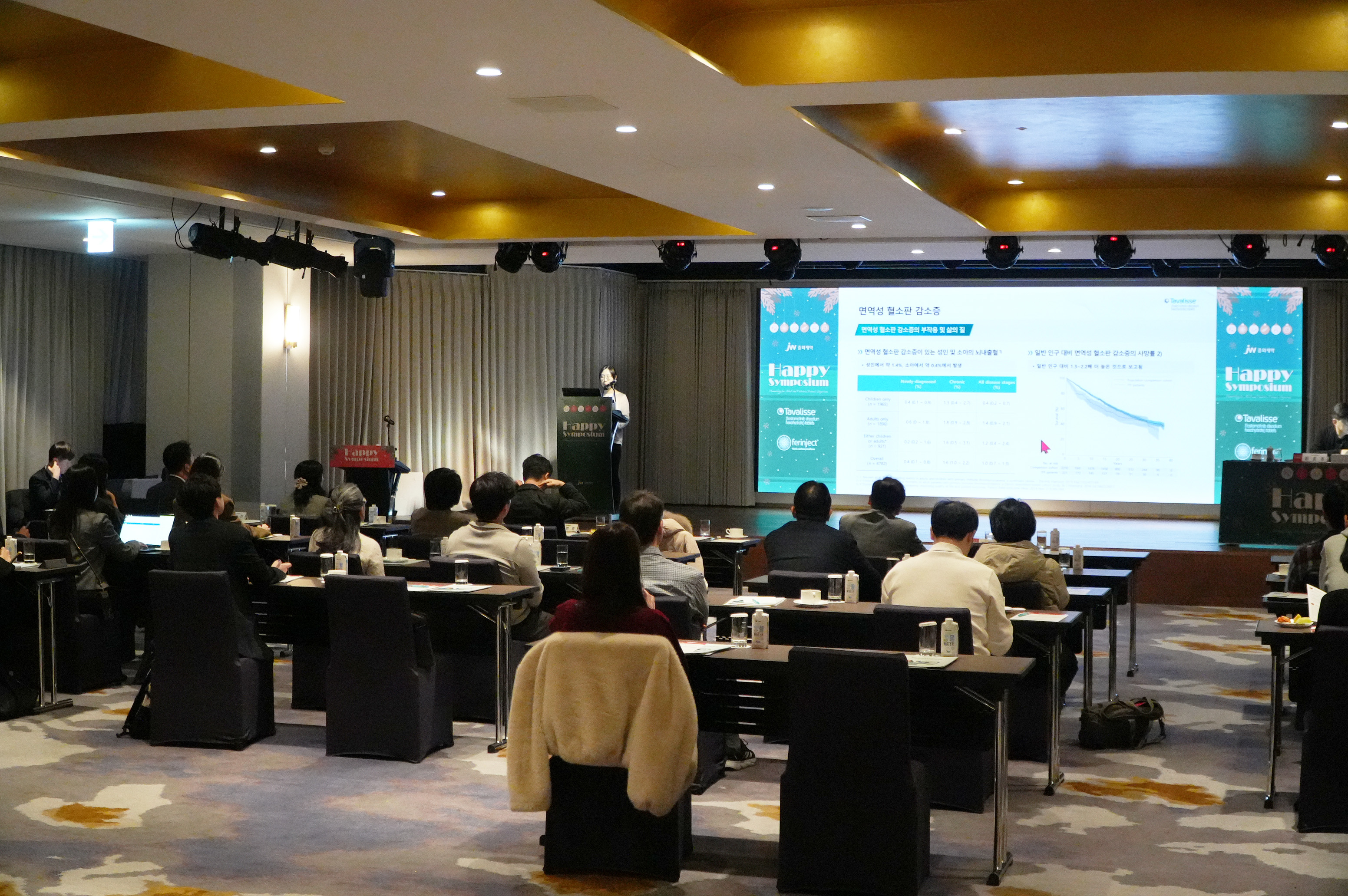 HAPPY 심포지엄은 JW중외제약의 혈액질환 관련 치료제인 A형 혈우병 치료제 ‘헴리브라’, 고용량 철분주사제 ‘페린젝트’, 면역질환 치료제 ‘악템라’, 면역성 혈소판 감소증(ITP) 치료제 ‘타발리스’의 최신 연구 데이터와 실제 진료 현장 경험을 공유하기 위해 마련된 통합 학술 행사다.