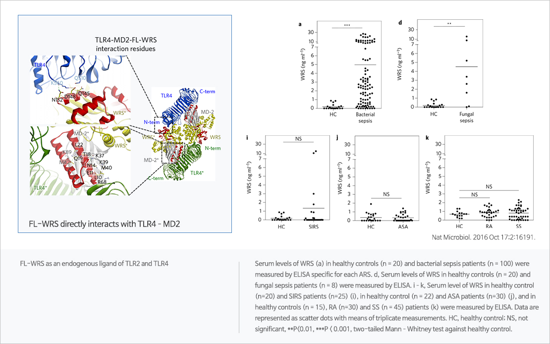 Tryptophanyl tRNA synthetase(WRS) is one of aminoacyl tRNA synthetases and has two forms – full length WRS (FL-WRS) and mini length WRS (mini-WRS, N-truncated form). In vitro study shows that FL-WRS could promptly trigger innate immunity against infection and be released immediately without de novo synthesis. In vivo study shows that WRS increases earlier than other sepsis biomarkers, such as procalcitonin and interleukin-6. Clinical trial shows that (1)WRS is superior to other biomarkers in terms of differentiating sepsis from inflammation, (2)the level of WRS could help to stratify the severity of the septic condition.