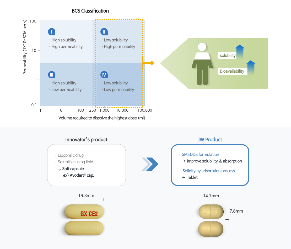 - JW Pharmaceutical's proprietary technology, which overcomes the shortcomings and limitations of existing poorly soluble drug formulations and improves the solubility and bioavailability of drugs to maximize drug safety and ease of administration.