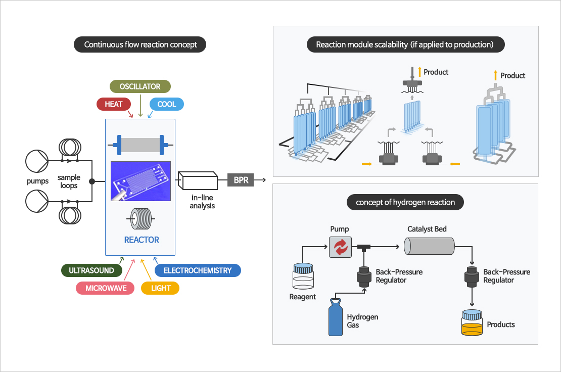 Flow chemistry or continuous flow chemistry begins with two or more streams of different reactants pumped at specific flow rates into a microreactor or packed bed column. After reaction was complted, the reaction mixture is collected at the outlet. Because of the inherent design of specific module, hazardous and explosive reaction are possible than batch reaction. It can continuously manufacture high quality API.