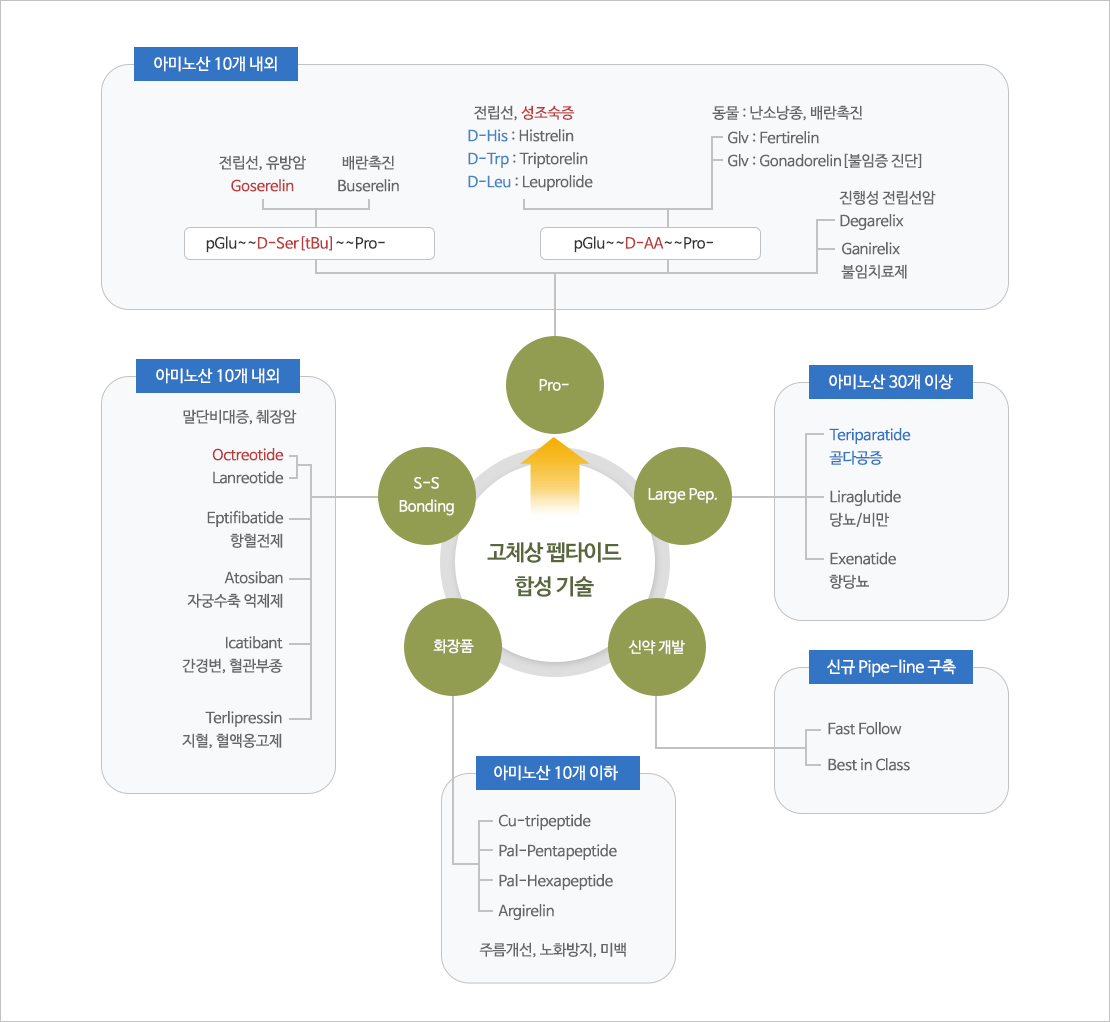 Resin에 첫번째 Amino acid를 붙인후 순차적으로 탈보호 및 커플링 반응을 통하여 Target Peptide를 제조합니다.